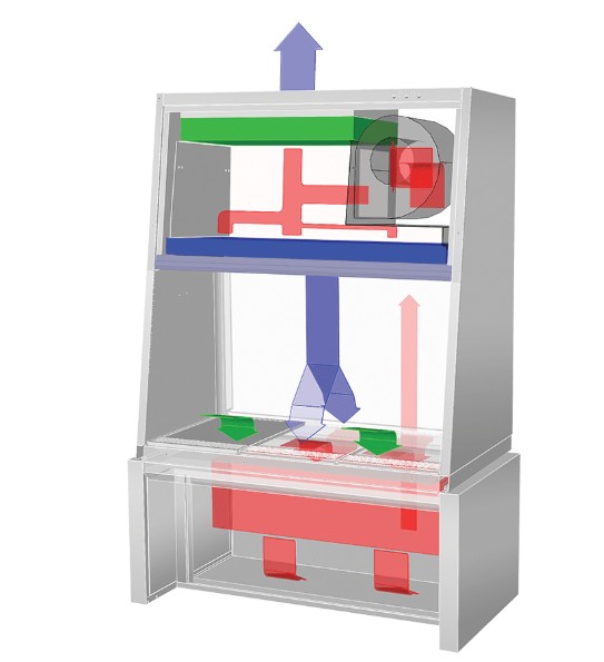 - El aire filtrado con filtro HEPA pasa a través de conductos internos en la pared posterior del gabinete hasta un plenum de aire común, donde el 35 % se expulsa a través del filtro de escape HEPA y el 65 % se fuerza uniformemente a través del filtro de suministro HEPA. Este aire esterilizado pasa luego a la cámara principal como flujo descendente, eliminando todos los contaminantes de la zona de trabajo.