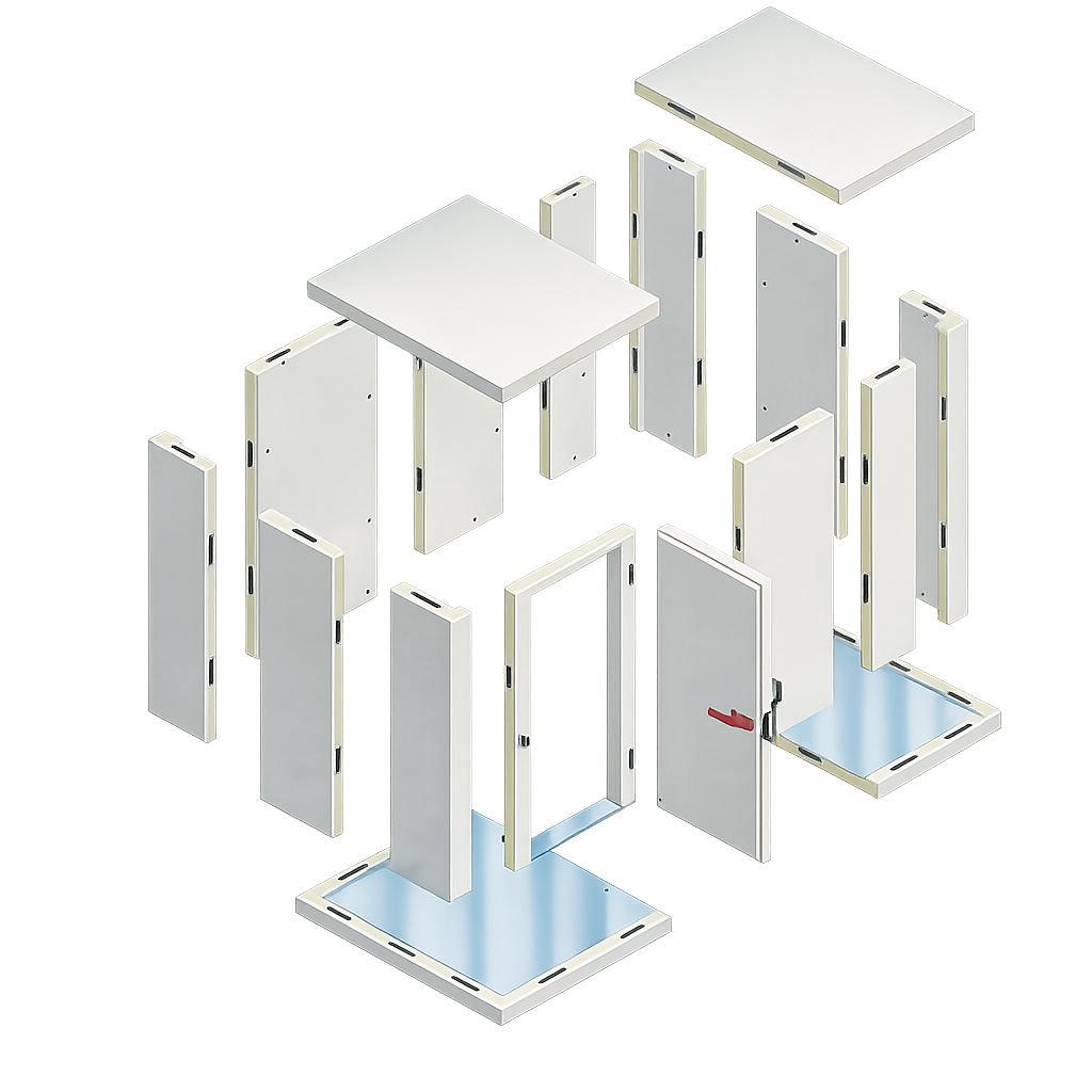 Más de 200 tamaños diferentes, disponibles en grosores de 80 mm y 100 mm. Los volúmenes oscilan entre 4 y 80 m³, con alturas de entre 2000 y 3000 mm. Los paneles fabricados en acero inoxidable se unen mediante fijaciones metálicas de cierre rápido. El aislamiento es de espuma de ciclopentano 100 % ecológico y sin CFC.