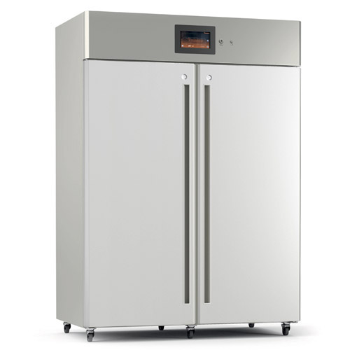 • Sistema Electrónico de Control: Equipados con un regulador-indicador electrónico touch screen de 9″, que muestra digitalmente la temperatura y humedad configuradas y reales. El regulador gestiona la temperatura interna mediante un sistema P.I.D. El panel de control, situado en la parte superior, incluye funciones como ON/OFF de la cámara, ajuste de temperatura de funcionamiento, visualización videográfica de temperaturas, y puerta USB para la descarga de datos.
