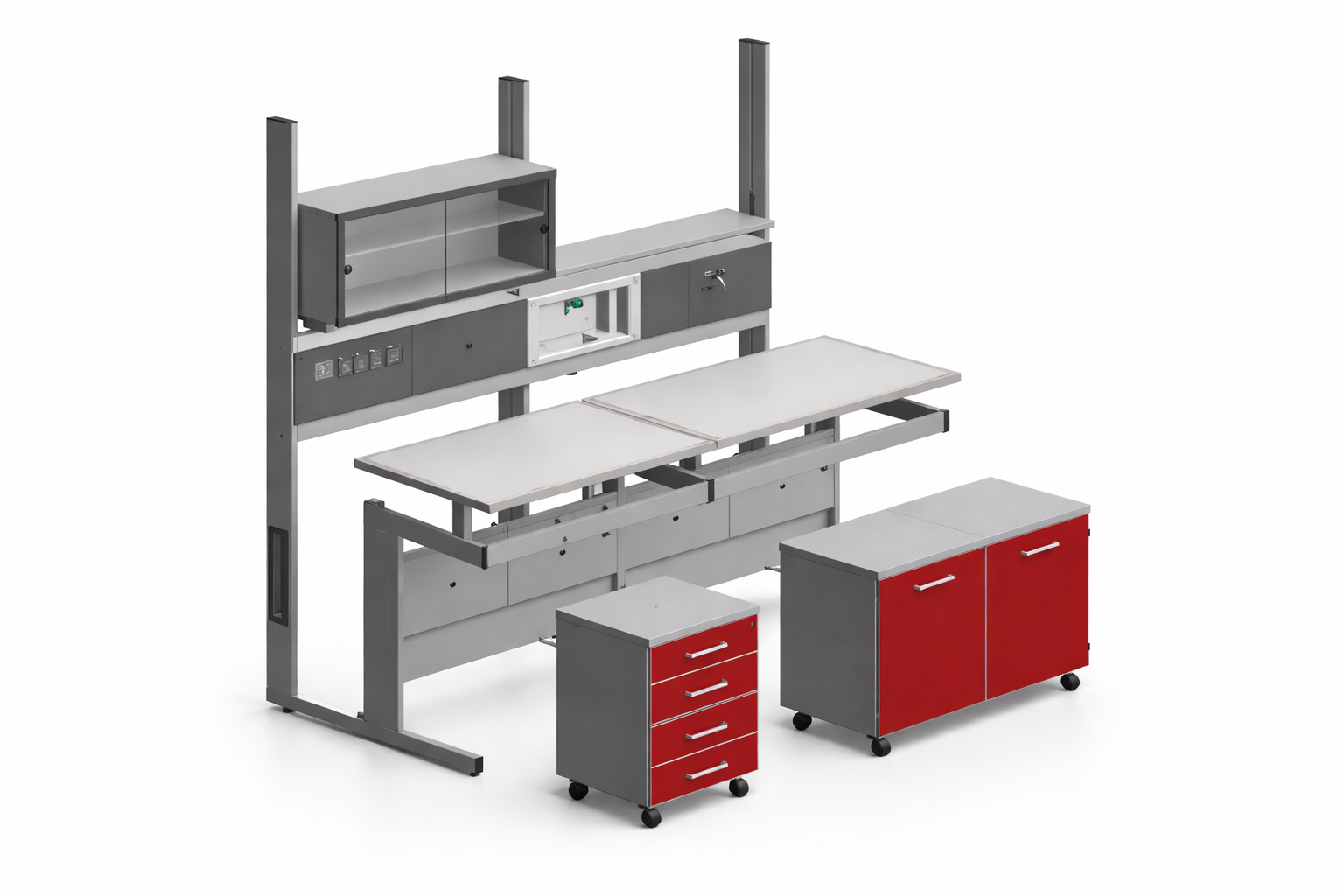 Sistema modular de bancadas para laboratorio, configurables en disposición de pared o central. Estructura en aluminio de alta resistencia y anticorrosión, con integración de servicios eléctricos, gases y agua a través de un módulo técnico oculto.