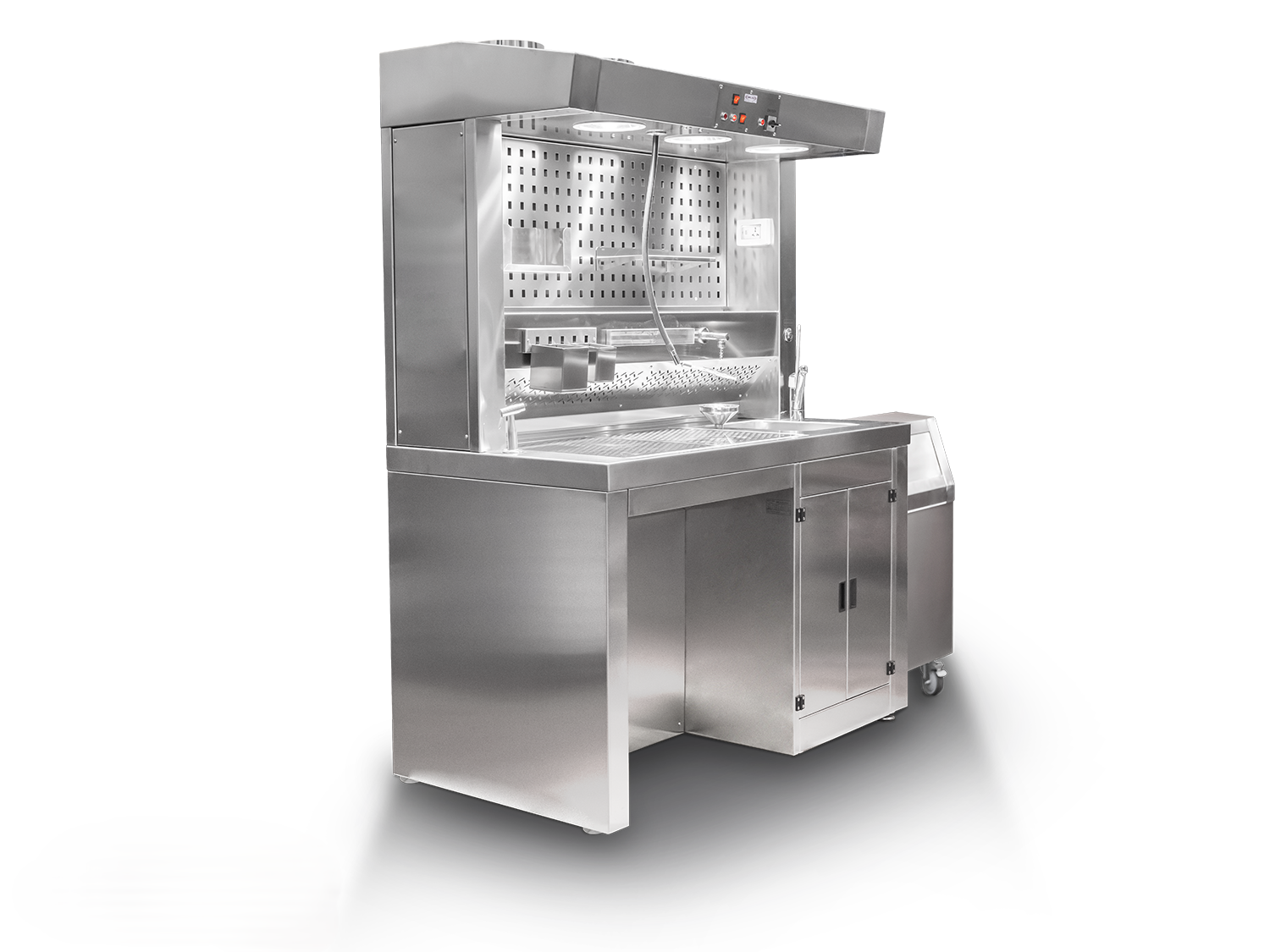 Este modelo cuenta con un sistema de extracción trasera (backdraft) que captura de forma directa los vapores generados durante el tallado. La rejilla inclinada situada en la parte posterior del área de trabajo dirige los vapores hacia el conducto de ventilación. La campana superior cuenta con panel abatible para facilitar su inspección y limpieza. Se ofrece con sistema de extracción autónoma (self exhaust) o conectada al sistema del edificio (in house).