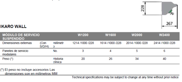 El módulo de servicio suspendido IKARO WALL, está diseñado para la instalación en pared, tipo frontal único. Carece de perfiles laterales de montaje.