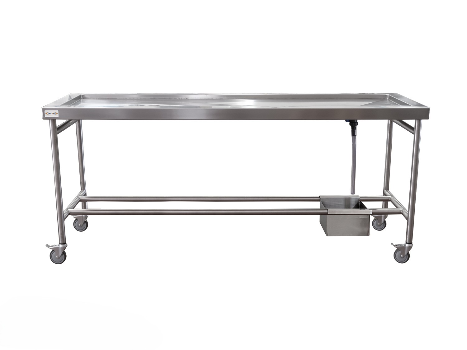 Fabricada completamente en acero inoxidable AISI 304, esta mesa ofrece una superficie duradera, fácil de limpiar y resistente a los agentes químicos comúnmente utilizados en entornos clínicos. Su inclinación positiva facilita el drenaje de fluidos hacia la cubeta inferior, donde se encuentra un sistema de evacuación con válvula de cierre de PVC de 1″.