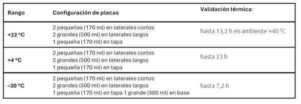 - Certificadas térmicamente con PCM (Phase Change Material) y hielo seco: Cumplen con los tiempos exigidos para +22°C, +4°C y –30°C.