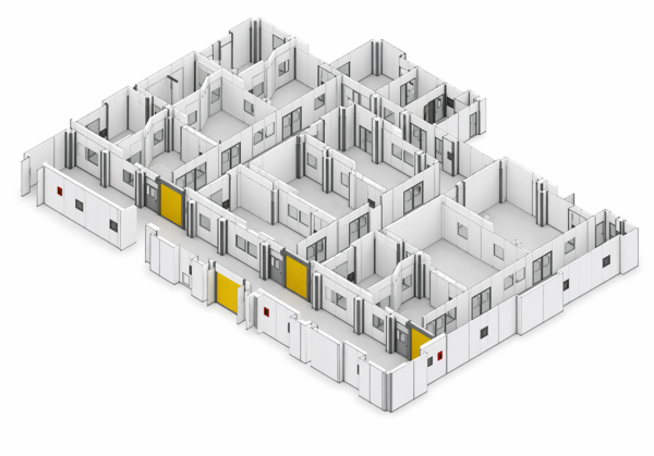 En cuanto a la conexión pared-suelo, se utiliza un zócalo de aluminio para las zonas no clasificadas, y se aplica una solución técnica específica para suelos de resina epoxi. Por su parte, las conexiones pared-techo ofrecen una solución de ensamblaje fácil para las esquinas verticales.